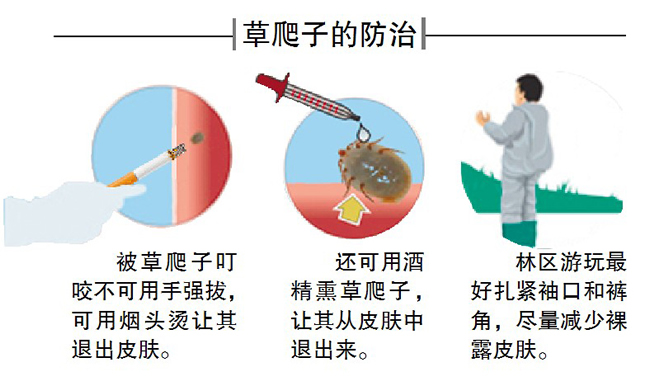 醫(yī)生提醒,為防止草爬子咬傷,市民到草叢、山林等地游玩后要及時檢查身體四肢、關(guān)節(jié)處等,如感覺皮下疼痛并有米粒大黑點(diǎn)要及時就醫(yī)。即使草爬子不帶病毒,不及時將其清出也會引起皮膚紅腫。